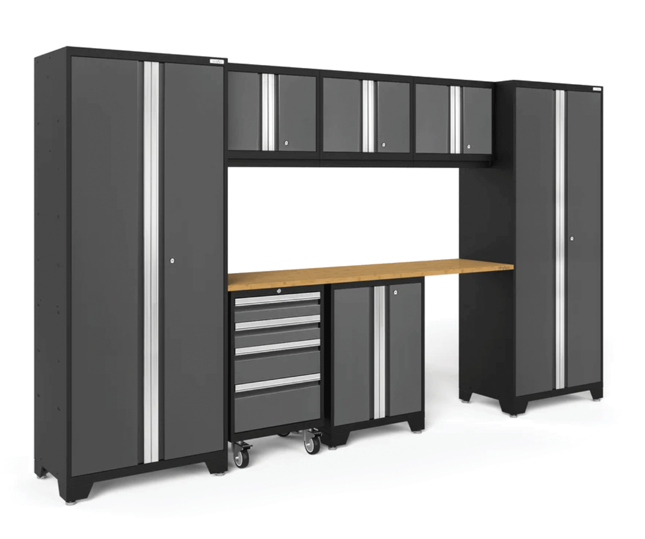 Meet the ultimate in garage organization. Hello Garage’s Designer Series Cabinets bring a clean, modern look with the toughness to support it. Constructed from 24-gauge steel and coated for lasting durability, these cabinets feature lockable doors, aluminum handles, and full-extension drawers—all complemented by a striking black-and-gray palette with bamboo countertops. They’re designed for those who want both form and function.