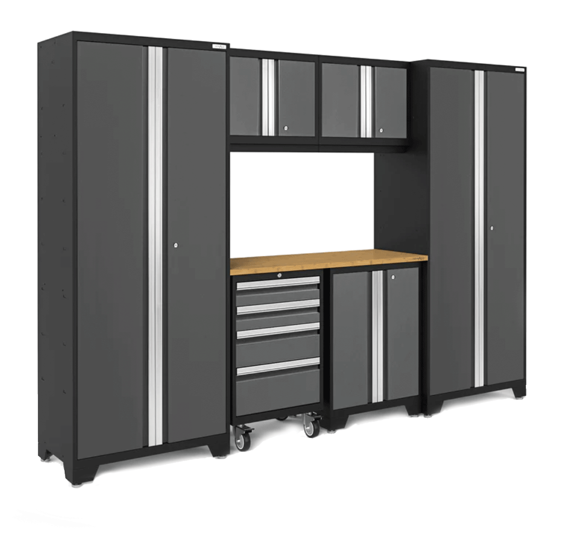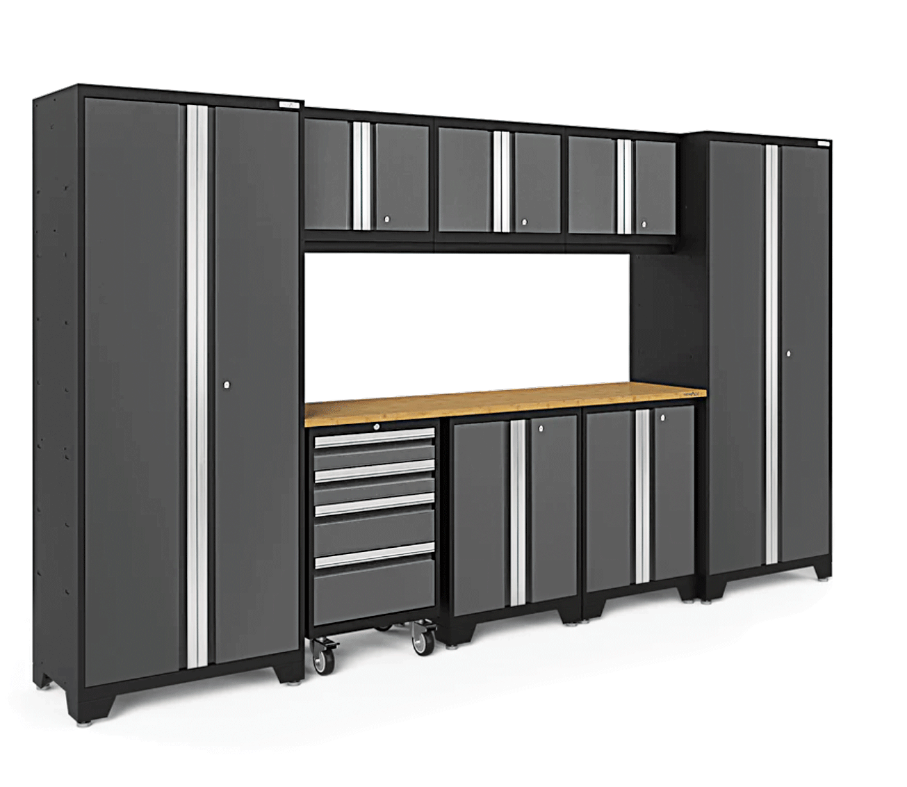 Introduce the ultimate in garage organization. Hello Garage’s Designer Series Cabinets deliver a modern, polished look with the toughness to back it up. Made from 24-gauge steel and coated for long-term performance, these cabinets include lockable doors, aluminum handles, and full-extension drawers—all framed by a sharp black-and-gray color scheme and bamboo countertops. They’re built for lasting style and durability.