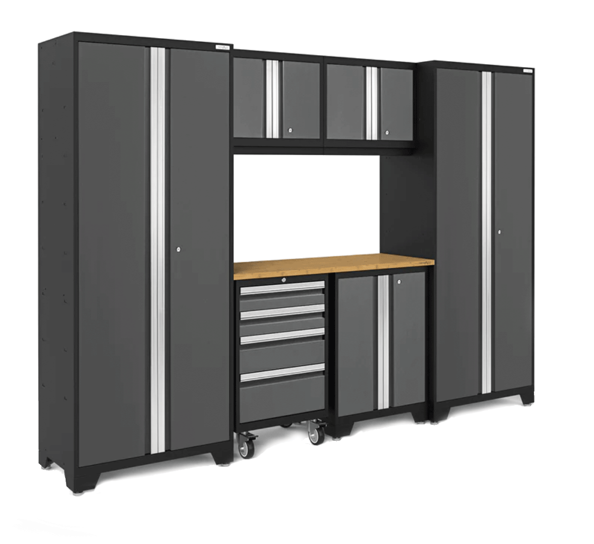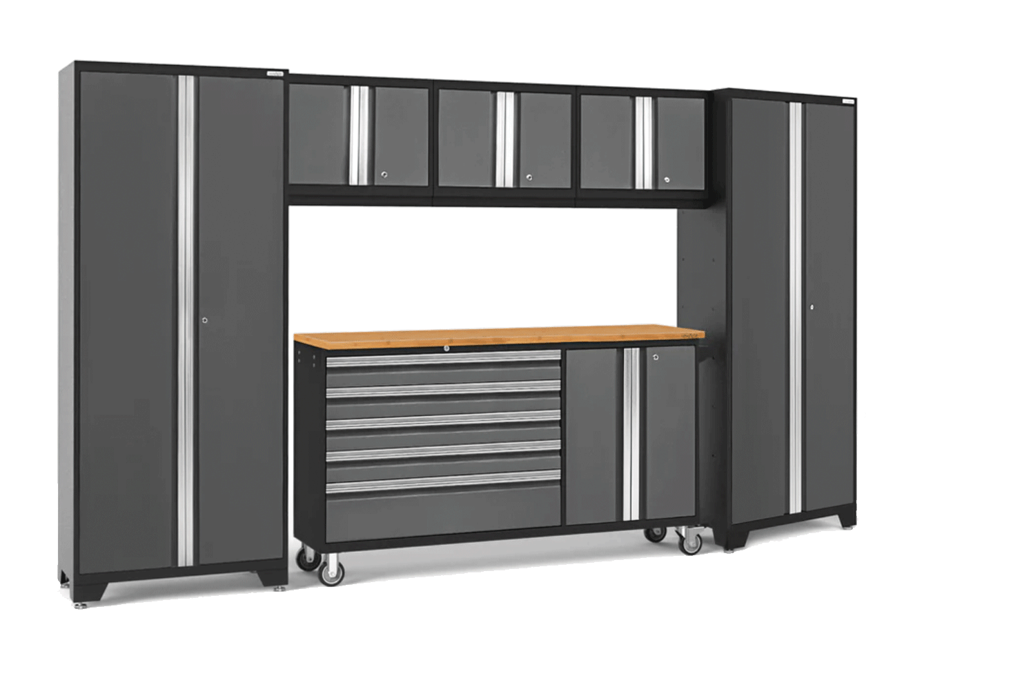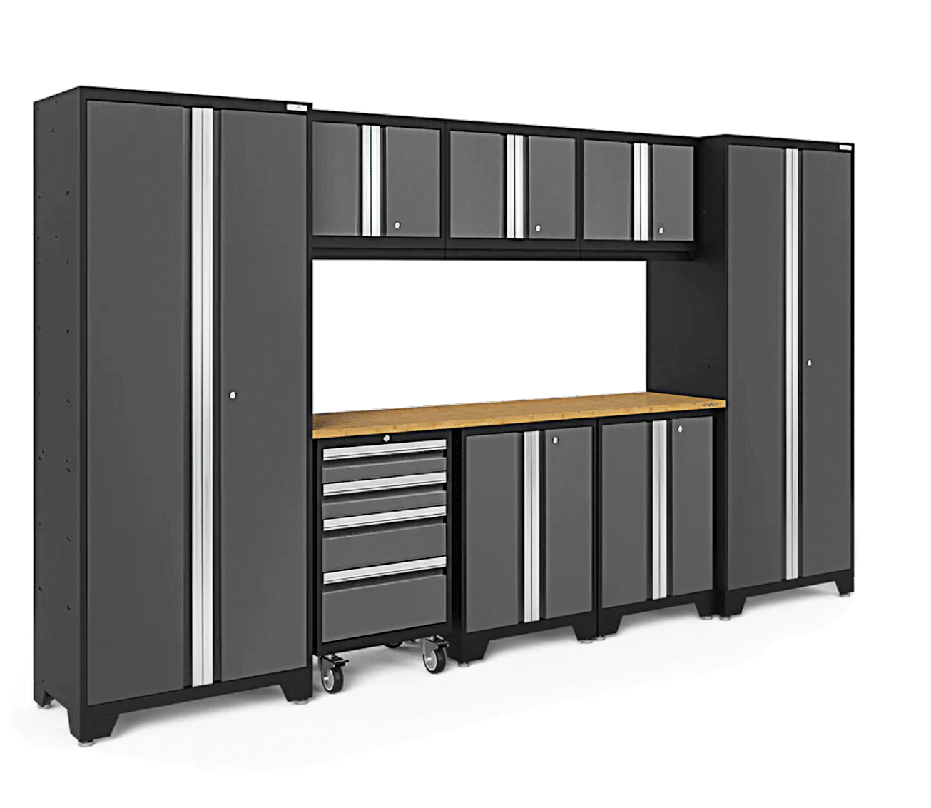 Create the ultimate in garage organization. Hello Garage’s Designer Series Cabinets offer a sleek, contemporary look with the toughness to match. Constructed from 24-gauge steel and finished for durability, these cabinets feature lockable doors, aluminum handles, and full-extension drawers—all set within a bold black-and-gray design and bamboo countertops. They’re built for both style and performance.
